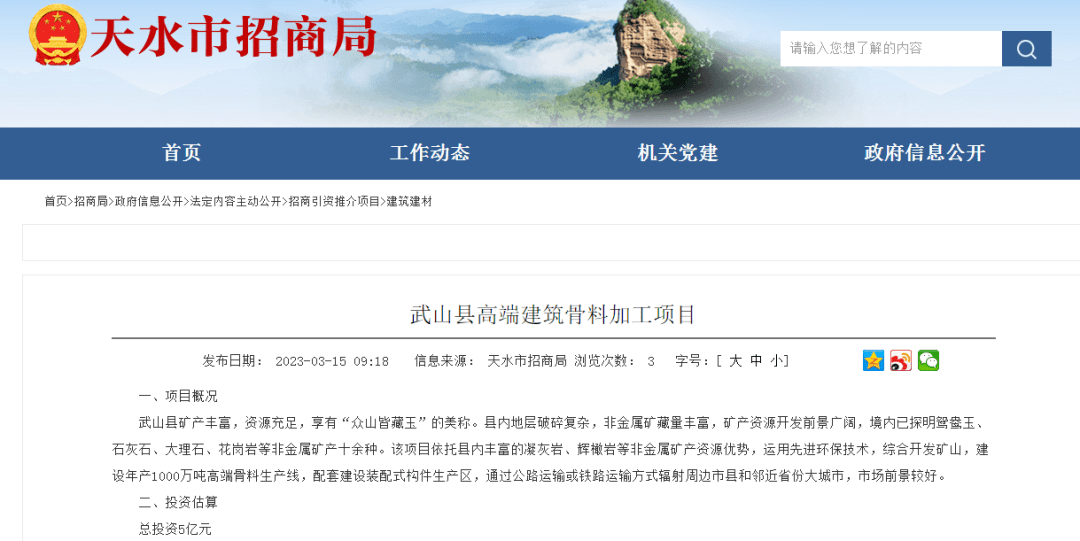 據(jù)中國砂石協(xié)會(huì)獲悉,近日,甘肅省天水市招商局公布了清水縣花崗巖建筑骨料生產(chǎn)項(xiàng)目和武山縣高端建筑骨料加工項(xiàng)目進(jìn)展情況,兩個(gè)項(xiàng)目合計(jì)投資23億元,每年共計(jì)生產(chǎn)加工4000萬噸建筑骨料。資源儲(chǔ)量共計(jì)約為11.2億噸!目前兩個(gè)項(xiàng)目都已完成項(xiàng)目建議書。